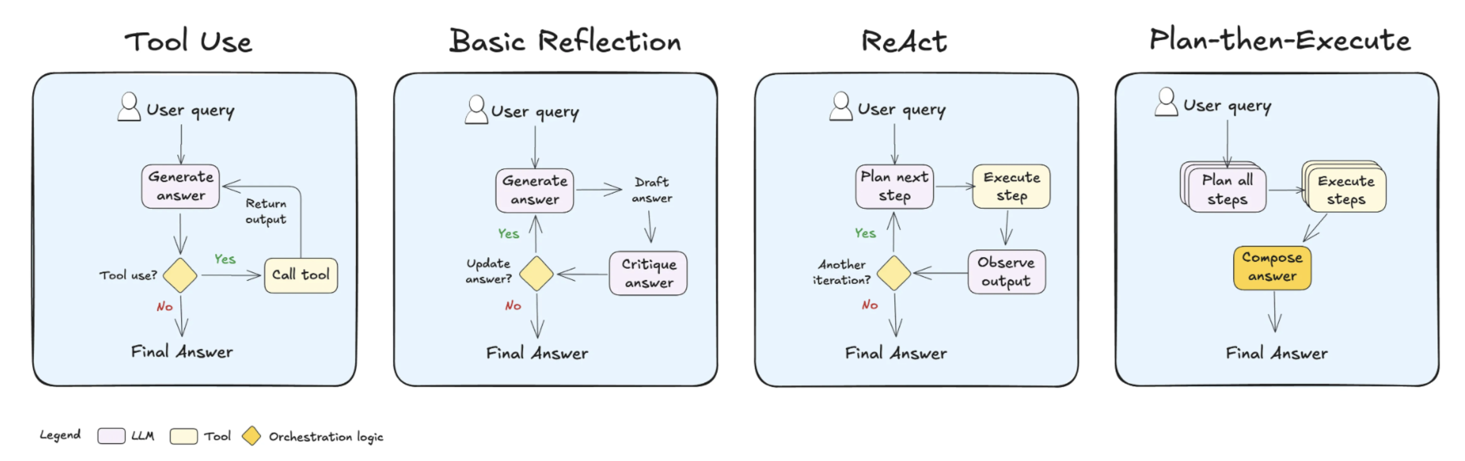 - Plan-then-Execute:Â The agent plans upfront by breaking the task into sub-steps (if needed) and then executes each step.